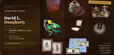 We are honored to present the Estate of David L. Dougherty, a respected longtime resident of Greenwood, South Carolina known for his 47-year banking career and service with the Greenwood Chamber of Commerce. Bid on well-kept furnishings and household items from a distinguished local estate.